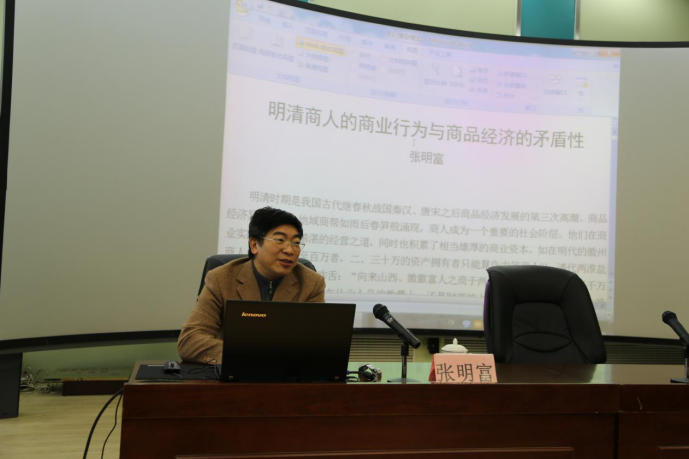 2016年12月16日上午,应suncitygroup太阳新城邀请,长江师范学院副院长、西南大学suncitygroup太阳新城博士生导师张明富教授在我校10号教学楼C区7楼学术报告厅作了题为《明清商人的商业行为与商品经济的矛盾性》的学术报告。报告由我校副校长田澍教授主持,suncitygroup太阳新城张嵘副教授、杨芳副教授以及博士、硕士研究生、本科生等150余人聆听了此次报告。