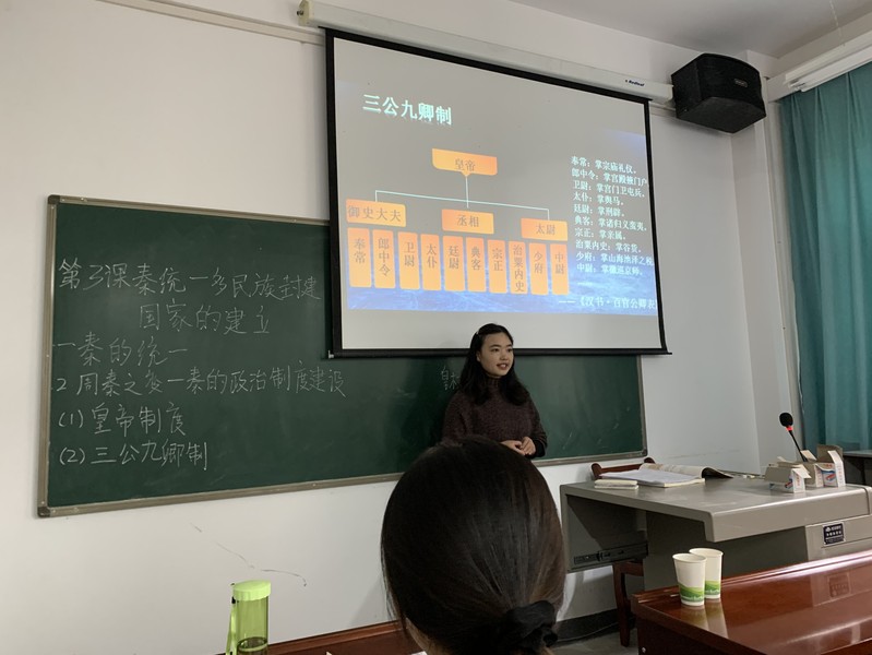 本次教学技能展示在田家炳教育书院211教室举行,邀请师大学附中的高级教师许彩霞、suncitygroup太阳新城教授李晓英和云亭青年教授张连银为评课教师,同学们展开集中观摩。本次展示主要以“同课异构”的形式为主,李凡和马海春两位同学基于不同的教材版本,围绕着“秦的统一和多民族国家的建立”的部分内容进行讲授。两位同学讲课结束后,三位老师分别给予点评。