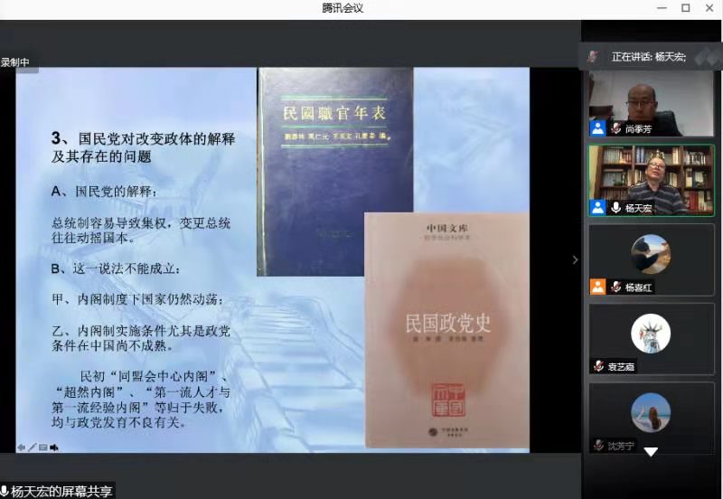 2020年12月22日,中国近现代史研究专家、四川大学杨天宏教授应suncitygroup太阳新城邀请,作了题为《民初政治史研究的几个关键问题》的学术讲座。此次讲座由suncitygroup太阳新城尚季芳教授主持,张嵘副教授、陶兴华副教授、侯培和老师以及全国220余名本科生、硕博研究生参加了本次讲座。受成都疫情影响,此次讲授的方式由线下改为线上。