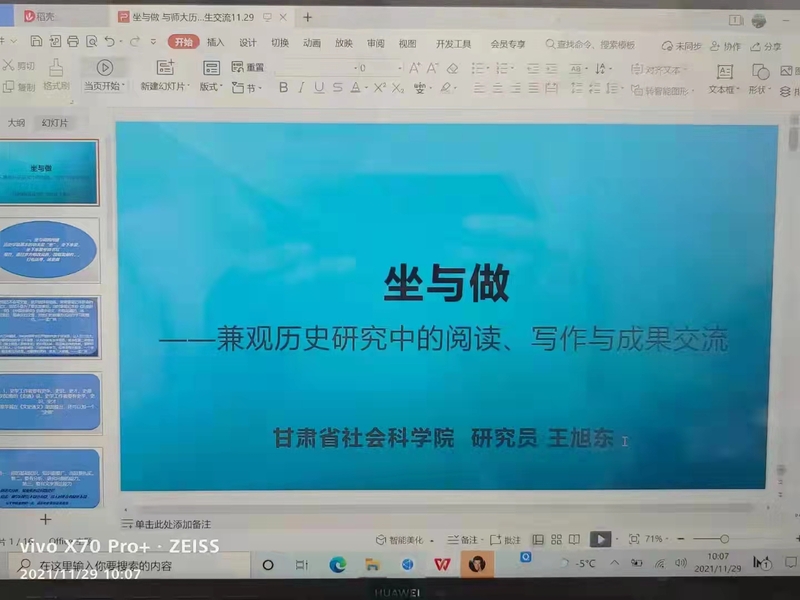 11月29日,应suncitygroup太阳新城邀请,甘肃省社会科学院王旭东研究员做了题为《坐与做——兼观历史研究中的阅读、写作与成果交流》的线上学术报告。报告由我院何玉红教授主持,学院研究生50余人参加。
