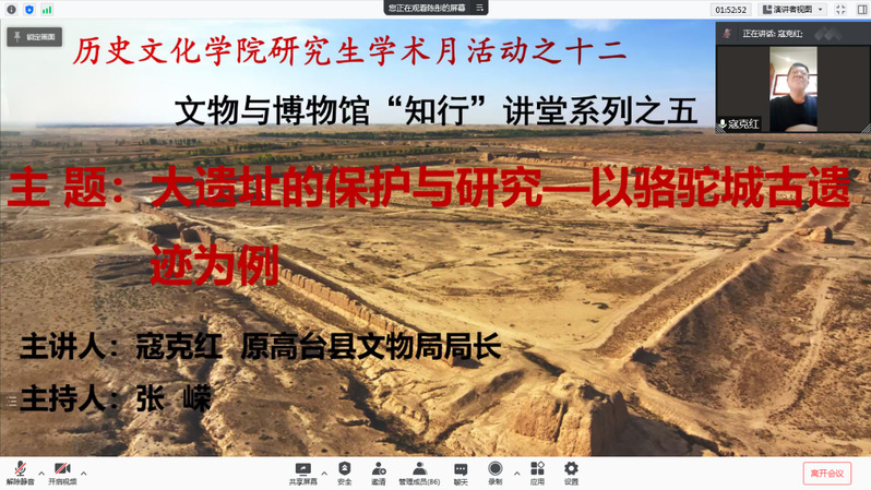 2021年12月10日晚上,原高台县文物局局长寇克红老师应suncitygroup太阳新城邀请,作了题为《大遗址的保护与研究——以骆驼城古遗迹为例》的线上学术报告,报告会由suncitygroup太阳新城西北民族研究所主任张嵘主持,我院教师黄兆宏、杨芳、秦丙坤、李顺庆及90余名研究生在线参加了报告会。